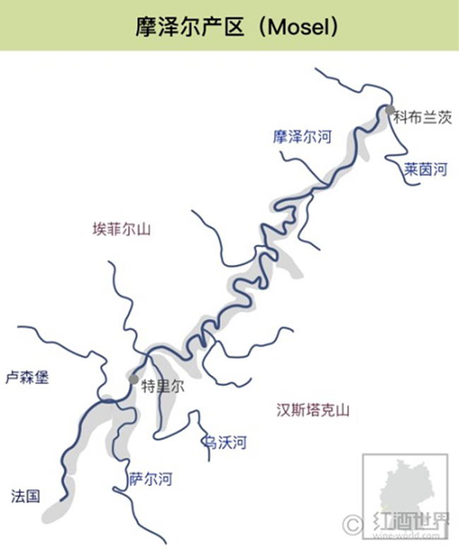 摩澤爾產(chǎn)區(qū)是德國13個法定葡萄酒產(chǎn)區(qū)之一,其產(chǎn)量在德國排名第三,不過,由于摩澤爾享譽國際的名聲,常常有人將其視為產(chǎn)區(qū)中的領頭者。摩澤爾產(chǎn)區(qū)包括摩澤爾河(Mosel River)及其支流薩爾河(Saar River)和烏沃河(Ruwer River)的河谷地區(qū),其名字也來源于摩澤爾河。實際上,在2007年8月1日之前,該產(chǎn)區(qū)名字為摩澤爾-薩爾-烏沃(Mosel-Saar-Ruwer),后來為了便于記憶而簡化為了摩澤爾。