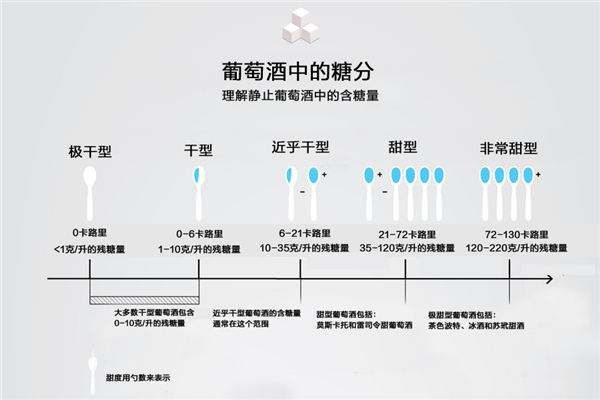 通常,殘糖量低于 1%的 葡萄酒被認為是干型;高于 3% 的葡萄酒被認為是“近乎干”或半甜型;高于 5% 以上是明顯的甜型!而甜葡萄酒殘糖量的范圍在 7-9% 之間。