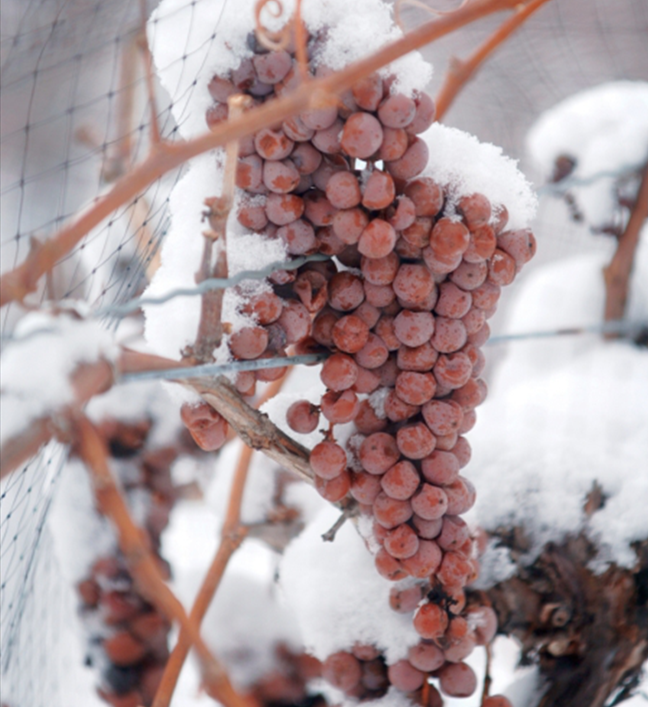 風干葡萄將“濃縮就是精華”奉為真理,冰葡萄則用冰霜鎖住精華。在寒冷地區,種植者們會將葡萄留于枝頭,成串結冰,直至嚴冬在夜間進行采收。冰葡萄硬度大,壓榨時需要施加較大壓力,榨出來的葡萄原汁僅有正常收獲葡萄的五分之一,卻濃縮了很高的糖分、酸度和風味物質。最終的成酒沒有風干葡萄酒那樣不加掩飾的奔放香氣與厚重酒體,而是以清潤甜美的風格自成一派。