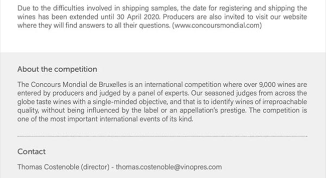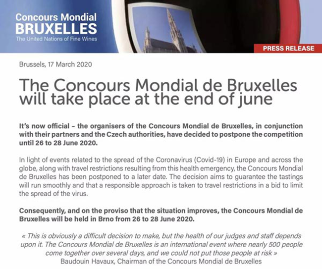 基于當(dāng)下新型冠狀病毒(Covid-19) 對(duì)于歐洲以及全球行業(yè)和國(guó)際旅行的影響,比利時(shí)布魯塞爾國(guó)際葡萄酒大獎(jiǎng)賽組委會(huì)現(xiàn)正式?jīng)Q定對(duì)第27屆大獎(jiǎng)賽進(jìn)行適度延期。此決定旨在應(yīng)對(duì)和防止疫情進(jìn)一步在歐洲地區(qū)擴(kuò)散,從而保證大獎(jiǎng)賽能夠有序順利舉行。