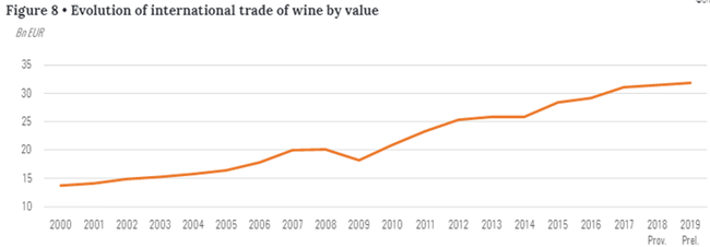 法國、意大利和西班牙是主要出口國,就2019年的價值而言,分別為98億歐元、64億歐元和27億歐元。這三個國家占2019年葡萄酒出口總值的60%。與2018年相比,新西蘭(+8.3%)、法國(+4.6%)、意大利(+3.4%)、葡萄牙(+2.5%)、智利(+2.1%)、阿根廷(+1.2%)、美國(+0.9%)和澳大利亞(+0.2%)的價值有所增長。與2018年相比,南非(-11.0%)、西班牙(-8.0%)和德國(-0.5%)的出口額有所下降。