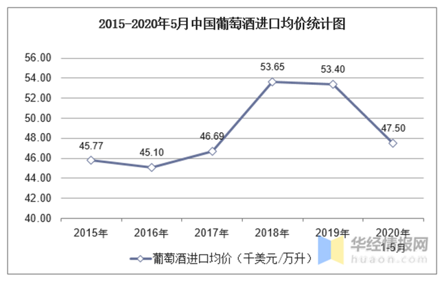 2015-2020年5月中國葡萄酒進(jìn)口均價統(tǒng)計圖