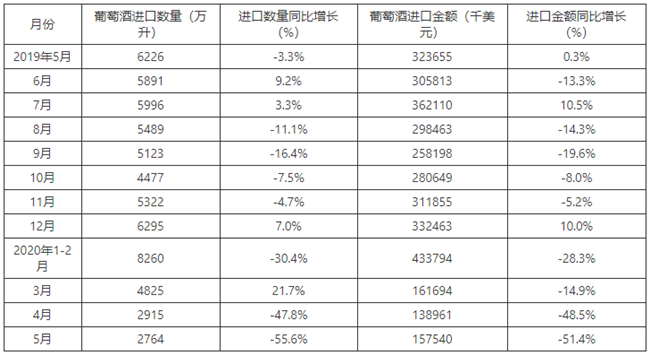 2015-2020年5月中國葡萄酒進(jìn)口數(shù)量及增速