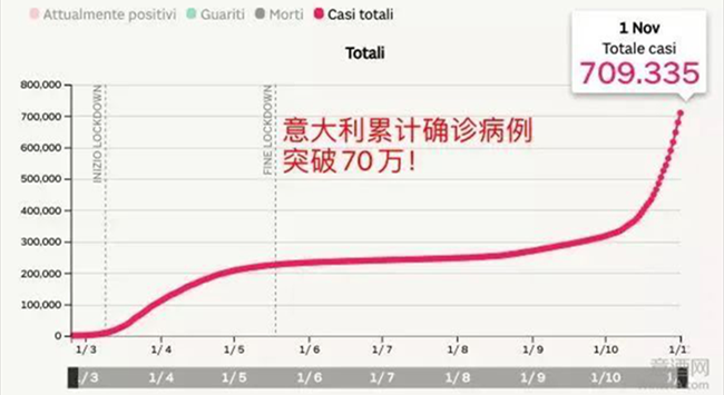 據(jù)意大利衛(wèi)生部11月1日公布的最新統(tǒng)計數(shù)據(jù),過去24小時意大利全國新增新冠病毒感染病例29907例,累計感染709335例;新增死亡208例,累計死亡38826例;累計治愈292380例,其中新治愈2954例。