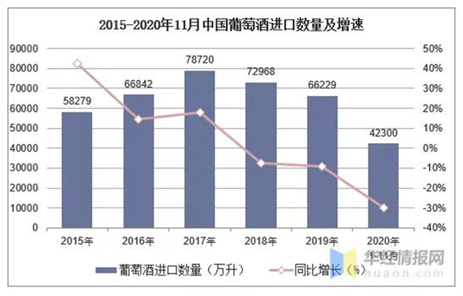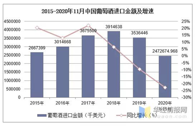 華經產業研究院數據顯示:2020年1-11月中國葡萄酒進口數量為42300.1338586萬升,相比上年同期增長了-17635.3661414萬升,降幅為29.7%;進口金額為2472674.968千美元,相比上年同期增長了-731646.032千美元,降幅為22.8%;2020年1-11月中國葡萄酒進口均價為58.46千美元/萬升。