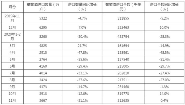2020年11月中國葡萄酒進口數量為3667.1338586萬升,同比下降31.1%;進口金額為312634.968千美元,同比增長0.4%。