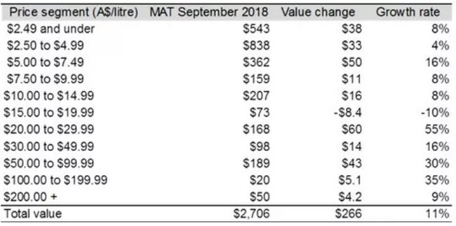 “在截止到9月30日的一年內(nèi),各個(gè)價(jià)格區(qū)間內(nèi)都有良好增長(zhǎng)。10澳元/升及以上的葡萄酒出口額增長(zhǎng)了20%至8.04億澳元,而20到29.99澳元之間的葡萄酒增長(zhǎng)尤其迅猛。10澳元/升以下的葡萄酒當(dāng)中,5到7.49澳元區(qū)間增速明顯,增長(zhǎng)了5000萬澳元。”