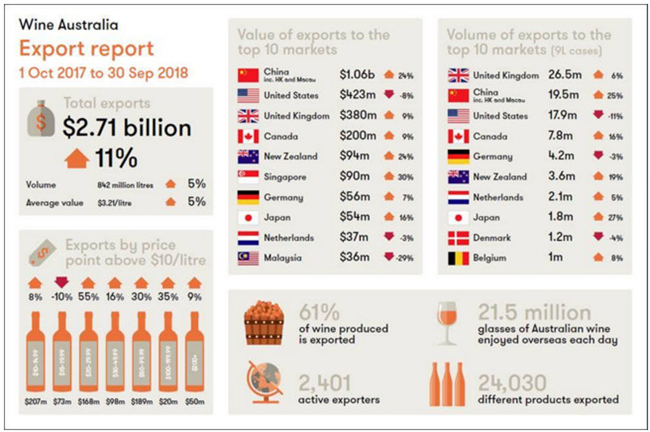 澳大利亞葡萄酒對(duì)全球出口額和出口總量持續(xù)走強(qiáng)。截止到2018年9月30日的一年中,澳大利亞葡萄酒出口總額增長(zhǎng)11%至27.1億澳元,出口總量增長(zhǎng)5%至8.42億升(或900萬箱9升裝,見表2)。