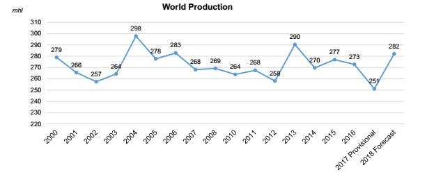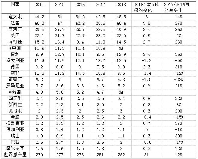 2017年全球葡萄酒產(chǎn)量下降8.2%,為近50年來最低值,而2018年產(chǎn)量將大幅提升,預(yù)計(jì)為282億升(mhl)。