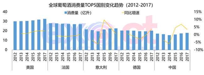 報(bào)告顯示,從2015年開始,中國(guó)葡萄酒消費(fèi)量持續(xù)增加,且增速保持在3.5%-6.8%。2017年,中國(guó)葡萄酒消費(fèi)量增加了0.6億升,全球占比7%,相比其他國(guó)家市場(chǎng)空間更大。