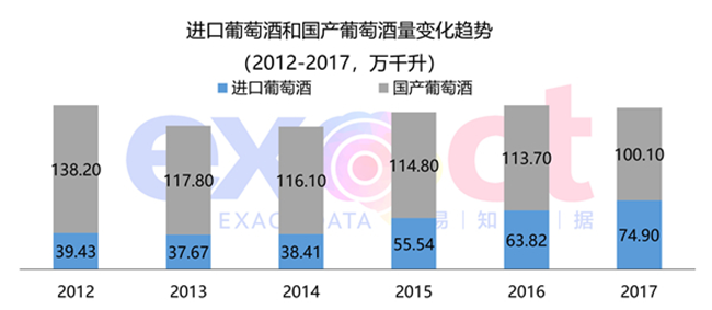 較之2013年,中國(guó)進(jìn)口葡萄酒總量5年內(nèi)翻了一番,2017年達(dá)到74.9萬(wàn)升,增幅17.35%,而國(guó)產(chǎn)葡萄酒產(chǎn)量增速為 -11.95%。
