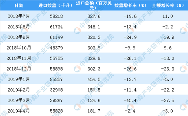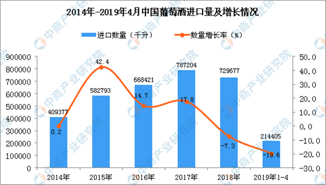 6. 2019年1-4月中國葡萄酒進口量同比下降19.6%