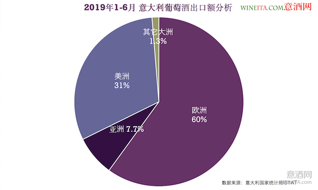 根據(jù)公布的數(shù)據(jù),2019年上半年,意大利葡萄酒出口額達到30億歐元,較2018年同期增長了3.1%。其中歐洲所占市場份額為60%(比例較2018年同期增長3.3%),美洲所占市場份額為31%(比例較2018年同期增加1.44%),亞洲所占市場份額為7.7%(比例較2018年同期增加8%)。此外,與2018年同期相比,2019年上半年意大利葡萄酒的總出口量增長了8.8%,對歐洲的出口量增長了11.2%,對亞洲的出口量增長了19.5%,對美洲的出口量減少了0.8%。