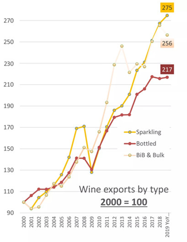 但是,從下圖可以看出,從2009年到2013年,散裝葡萄酒的出口增長(zhǎng)速度一度比瓶裝酒快很多。這個(gè)速度在2014-2016年之間有所減緩,2019年也有放緩趨勢(shì)。