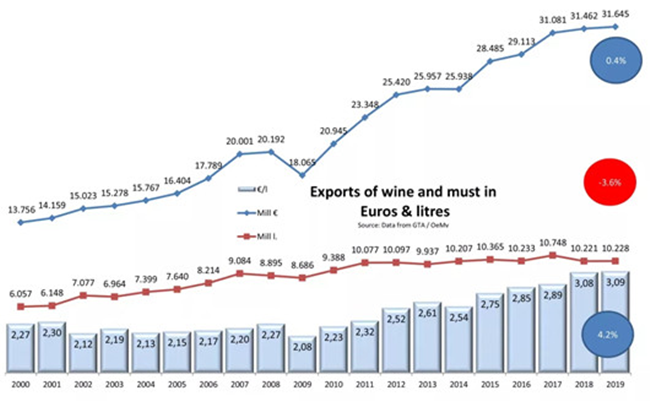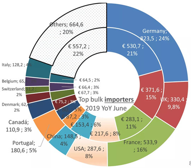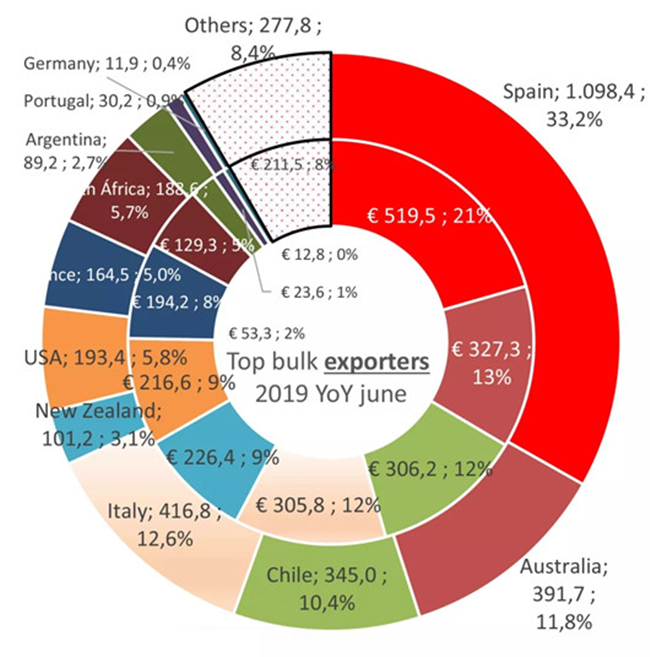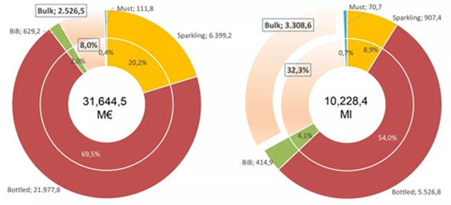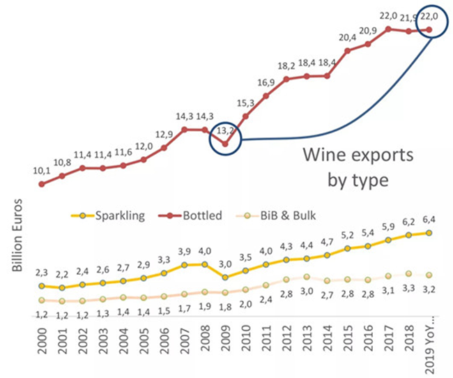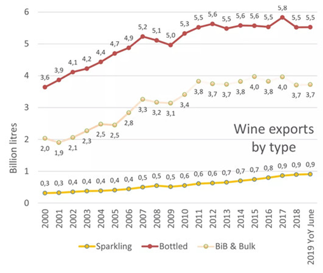 截止至2019年6月,散裝葡萄酒的出口價(jià)值為25億歐元,占所有葡萄酒出口總價(jià)值的8%。盒中袋裝葡萄酒(BIB)的出口價(jià)值占出口總價(jià)值的2%,起泡酒占出口總價(jià)值的20.2%,瓶裝酒占出口總價(jià)值的69.5%,葡萄汁占出口總價(jià)值的0.4%。