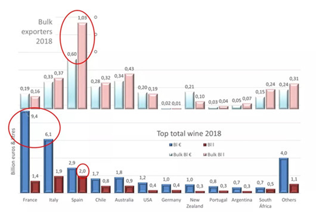從散裝酒出口數(shù)量上來(lái)看,西班牙遙遙領(lǐng)先,達(dá)到了10.3億升,總價(jià)值為6億歐元。但是從葡萄酒總銷(xiāo)售額方面來(lái)看(不包括散裝酒),法國(guó)和意大利葡萄酒在出口價(jià)值方面遙遙領(lǐng)先,法國(guó)達(dá)到了94億歐元,意大利達(dá)到了61億歐元,而西班牙僅為20億歐元。