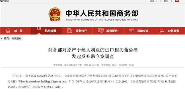 8月31日,商務部發布2020年第35號公告,決定即日起對原產于澳大利亞的進口裝入2升及以下容器的葡萄酒進行反補貼調查。該產品英文名稱:Wines in containers holding 2 liters or less,歸在《中華人民共和國進出口稅則》:22042100。本次調查通常應在2021年8...