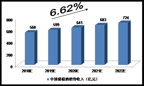 2016年,全國規(guī)模以上葡萄酒企業(yè)共240家,累計實現(xiàn)銷售收入484.54億元,同比增長3.97%。我們預(yù)計,2018年我國葡萄酒銷售收入將達到560億元,未來五年(2018-2022)年均復(fù)合增長率約為6.62%,2022年將達到724億元。