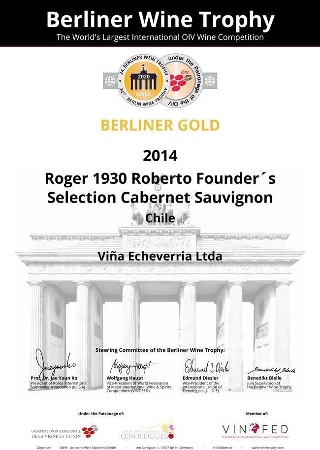 (羅吉爾1930-羅伯特——2020柏林葡萄酒大獎賽金獎 榮譽證書)
