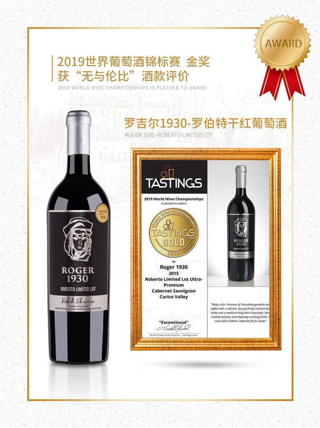 安智利雅家族酒莊旗下Roger1930系列產(chǎn)品是該酒莊現(xiàn)任莊主Roberto Echeverria為紀(jì)念他的曾曾祖父——羅伯特家族第一任莊主、酒莊創(chuàng)始人Roger先生(Roger piffre de Vauban羅吉爾·皮夫拉·德·沃班)誕辰100周年時,推出以曾曾祖父Roger先生名字命名的限量紀(jì)念版產(chǎn)品。Roger1930系列葡萄酒,作為酒莊珍藏限量紀(jì)念版產(chǎn)品,采用酒莊最頂級的葡萄,莊主親釀,人工采摘,手工蠟封,橡木桶陳年12-24個月,每年限量2000瓶。該系列產(chǎn)品在智利國內(nèi)基本不對外銷售,只作為酒莊招待貴賓、禮送親朋的佳釀。