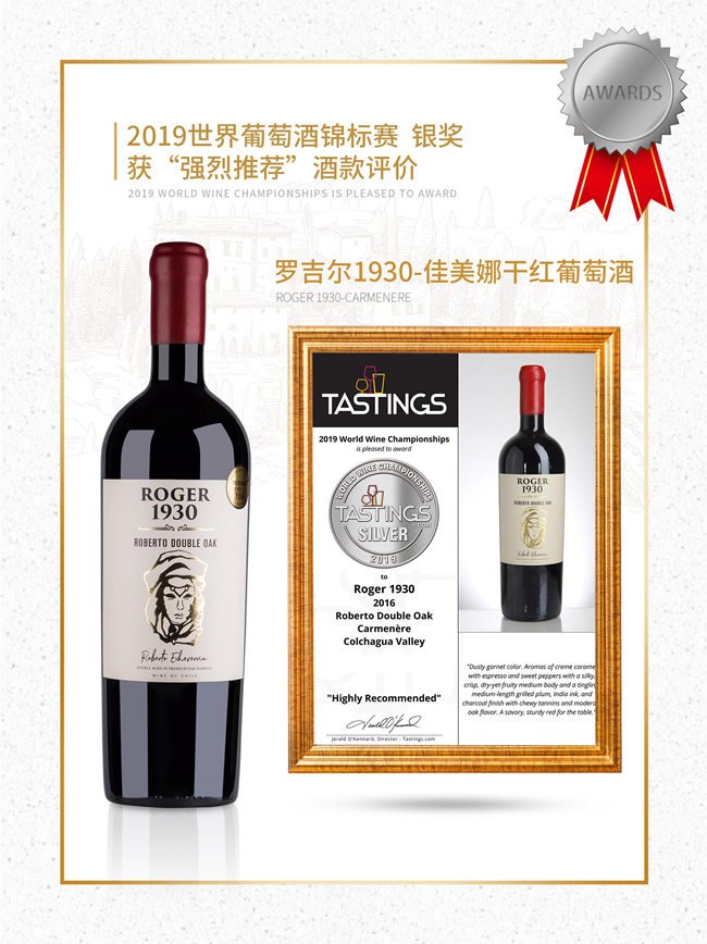 羅吉爾1930-羅伯特紅葡萄酒呈深邃的寶石紅色;酒香非常柔和,伴有精致的黑加侖,黑李子的果香以及甘草、煙熏的香氣;口感優(yōu)雅豐富,層次鮮明且多變,單寧強勁,令人十分愉悅。在榮獲2020柏林葡萄酒大獎賽金獎的榮譽之前,就已經(jīng)獲得了2019世界葡萄酒錦標(biāo)賽金獎的榮譽,以及“無與倫比”酒款評價!