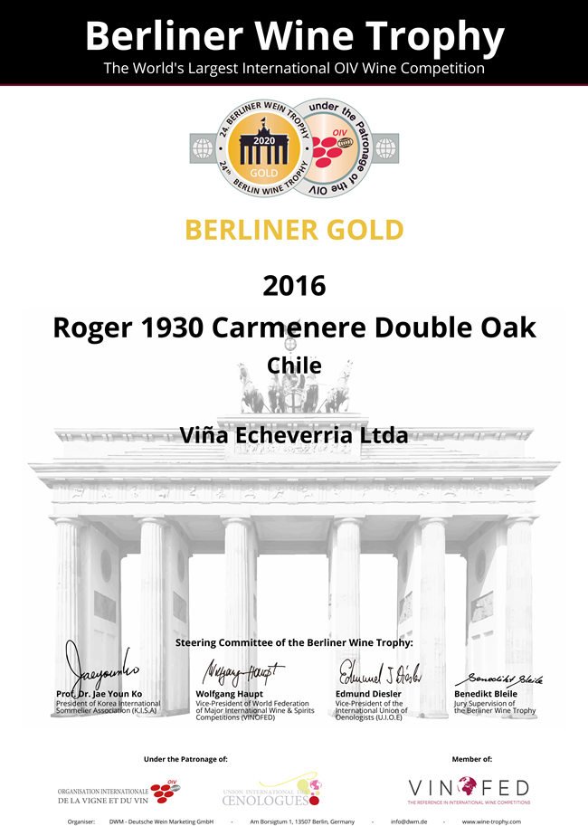 (羅吉爾1930-佳美娜——2020柏林葡萄酒大獎賽金獎 榮譽證書)