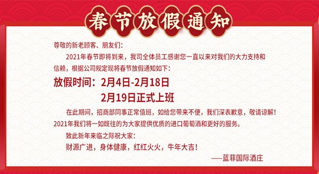 白駒過隙,又是一年春節(jié)到!惜別2020年,迎來了充滿希望、機遇和挑戰(zhàn)的2021年!正值中國的傳統(tǒng)節(jié)日“春節(jié)”來臨,在此藍(lán)菲酒業(yè)全體員工向大家拜個早年!恭祝大家新春快樂,財源廣進(jìn)!